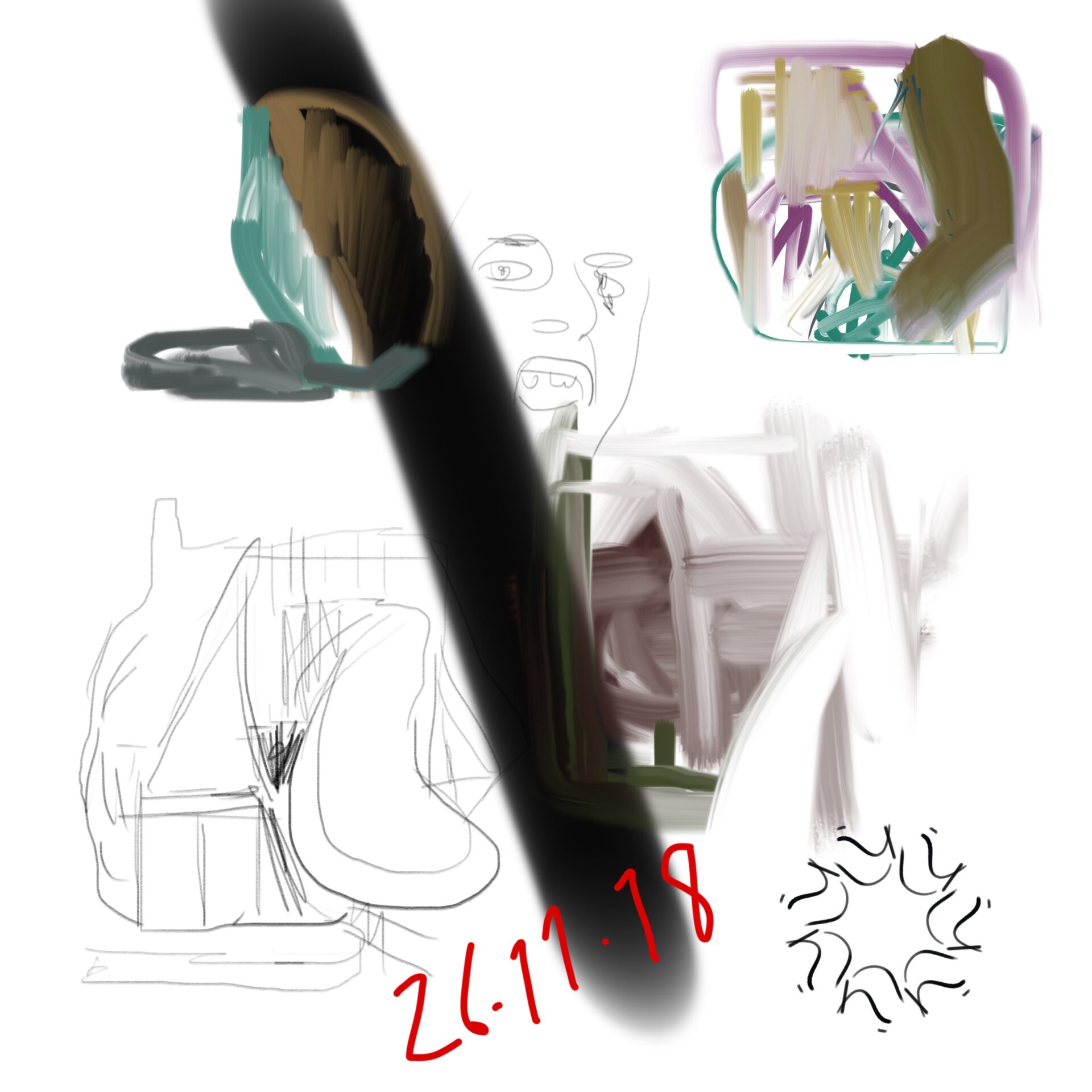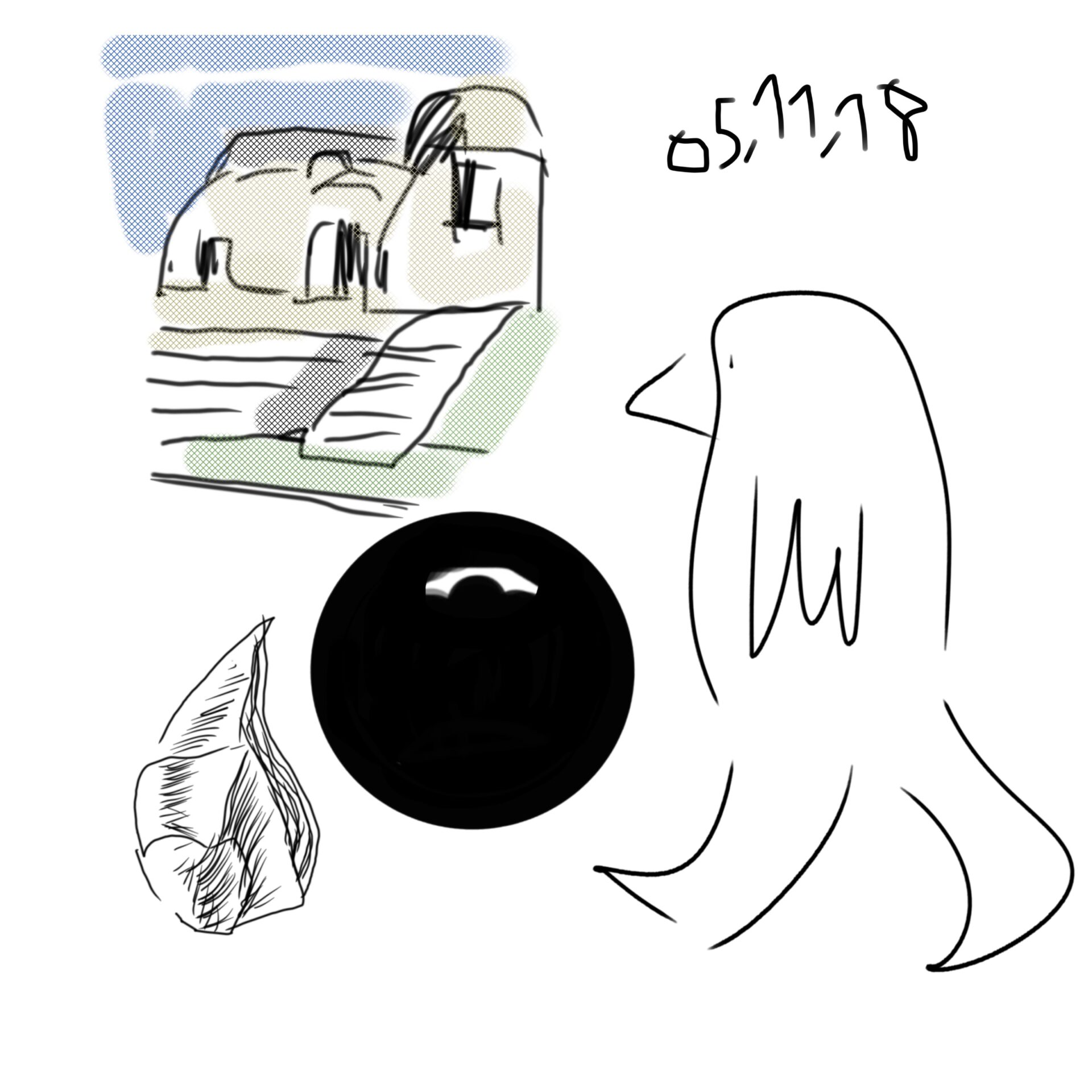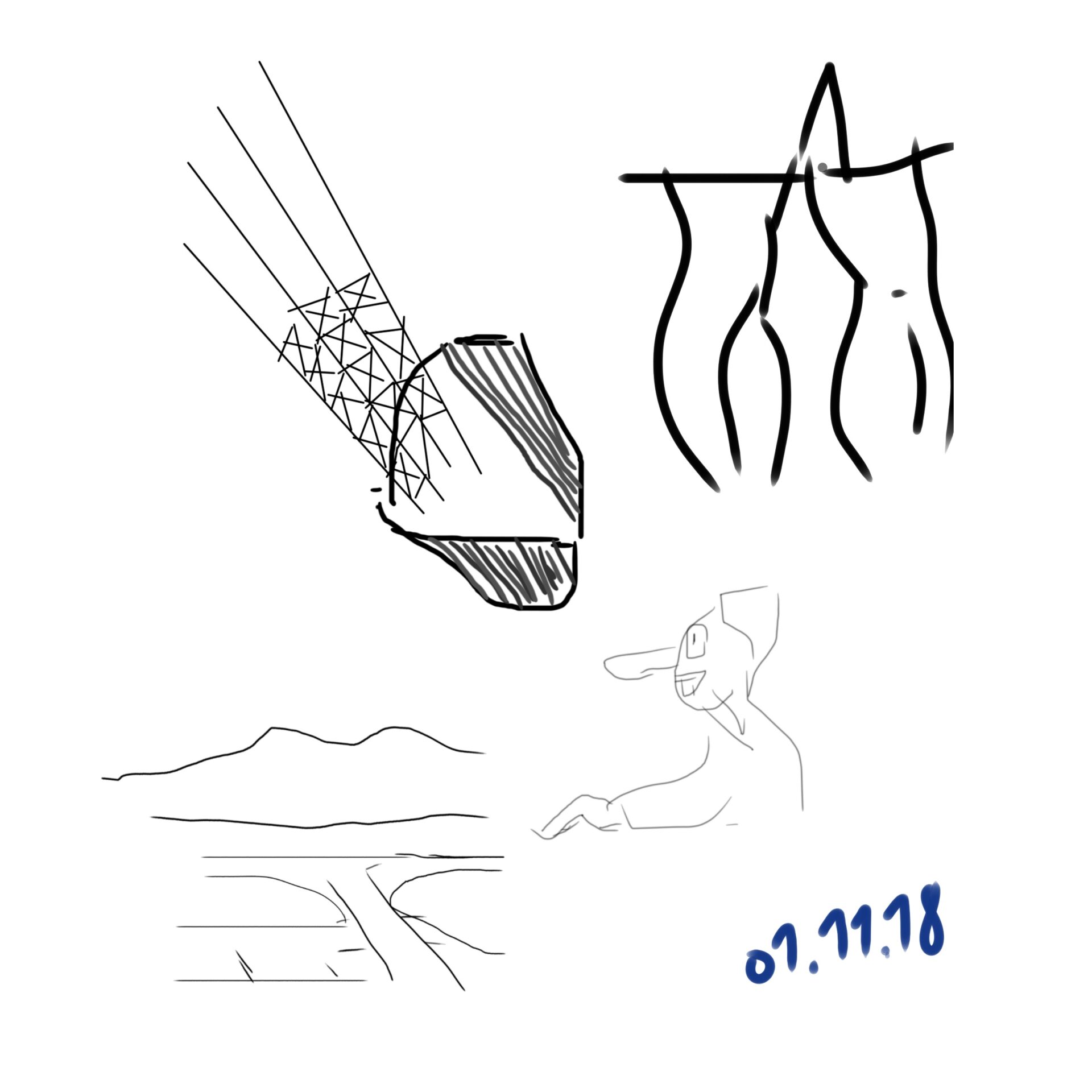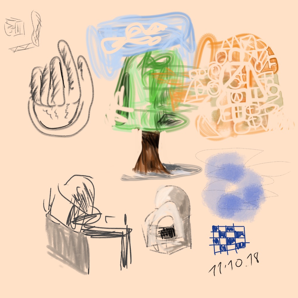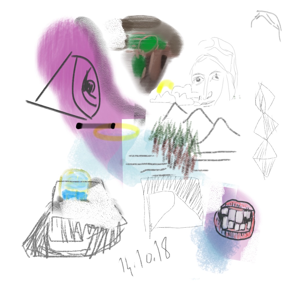 croquis gribouillages, idées du jour d’Octobre ou Novembre 2018 et notamment en route vers Sarajevo pour assister à Beyond Good And Evil lors du festival de Jazz, sur écran tactile 4 pouces avec l’application sketchbook