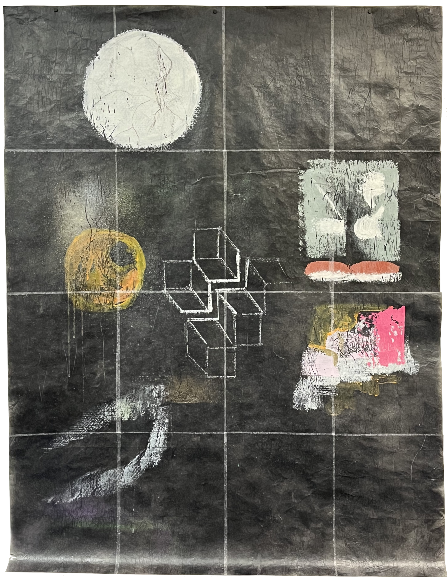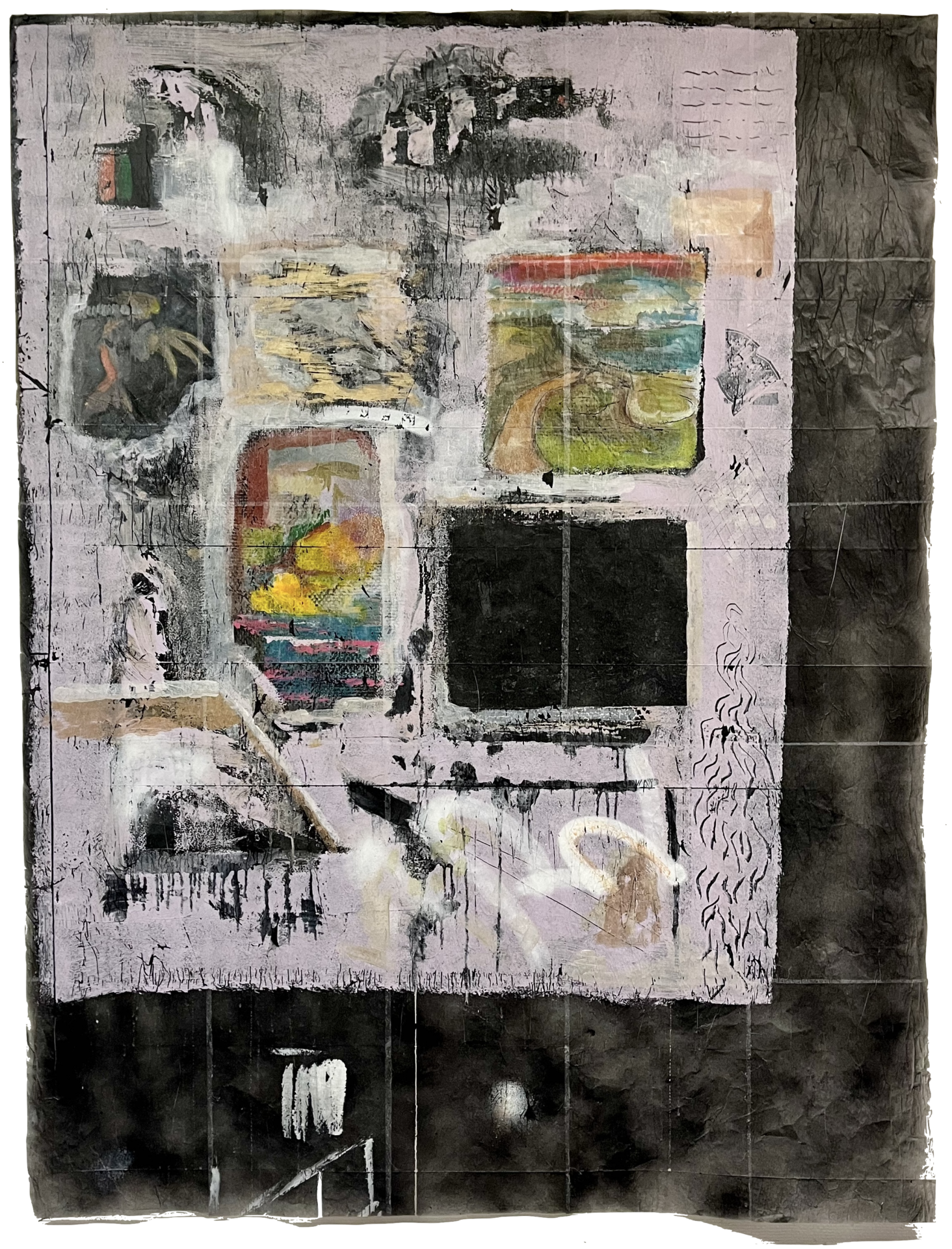 Acrylique, fusain, grattage, peinture aérosol, papier de soie
